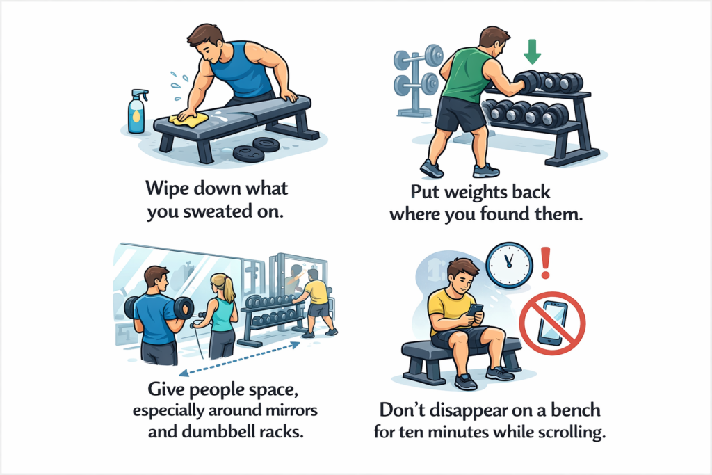 - While you warm up, look around casually. You’re collecting “map data” so the gym starts feeling familiar.